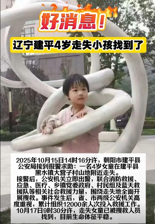 2025年10月15日14時,當(dāng)“4歲女童走失”的警情從遼寧建平傳出,一場跨越地域與身份的愛心接力就此啟程,最終以“生命體征平穩(wěn)”的消息畫上圓滿句點。這不僅是一次搜救的成功,更是一幅“一方有難八方支援”的生動畫卷。